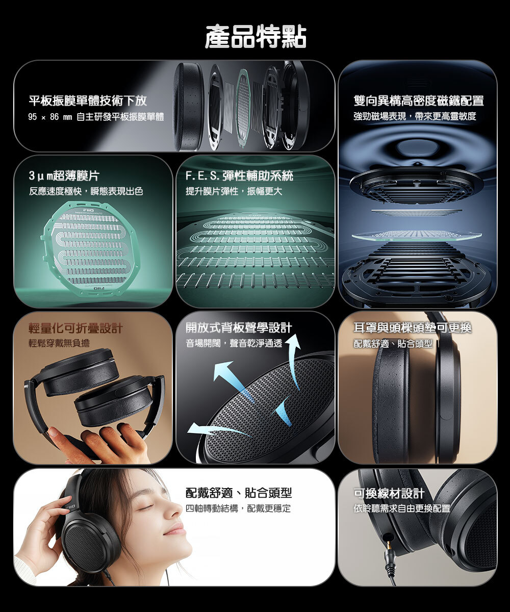 ※與傳統動圈或動鐵單元相比,平板振膜單元以整面電磁力驅動輕薄振膜發聲,受力均勻,幾乎不存在動圈分割振動問題,失真低、瞬態反應佳,聲場寬廣;平板單元的製造工藝更為複雜,因此成本通常較高。