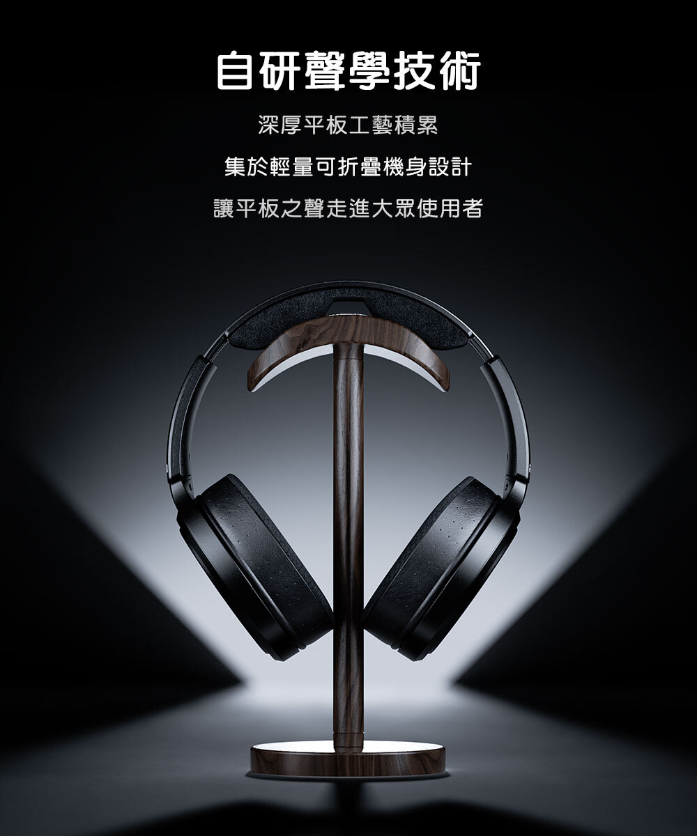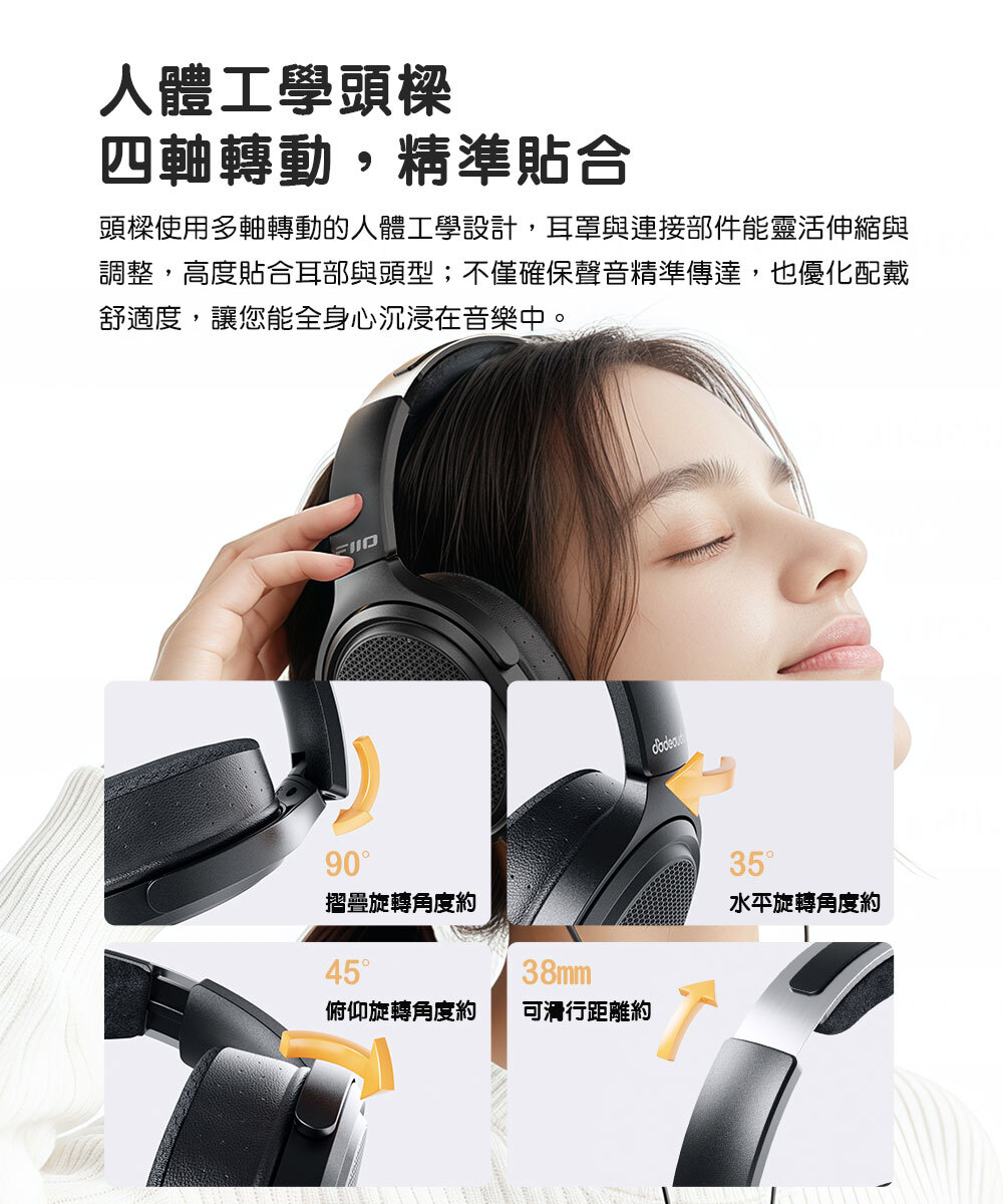 頭樑使用多軸轉動的人體工學設計,耳罩與連接部件能靈活伸縮與調整,高度貼合耳部與頭型;不僅確保聲音精準傳達,也優化配戴舒適度,讓您能全身心沉浸在音樂中。