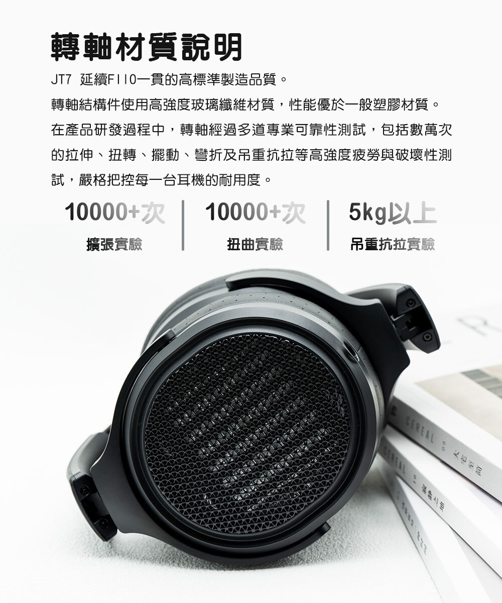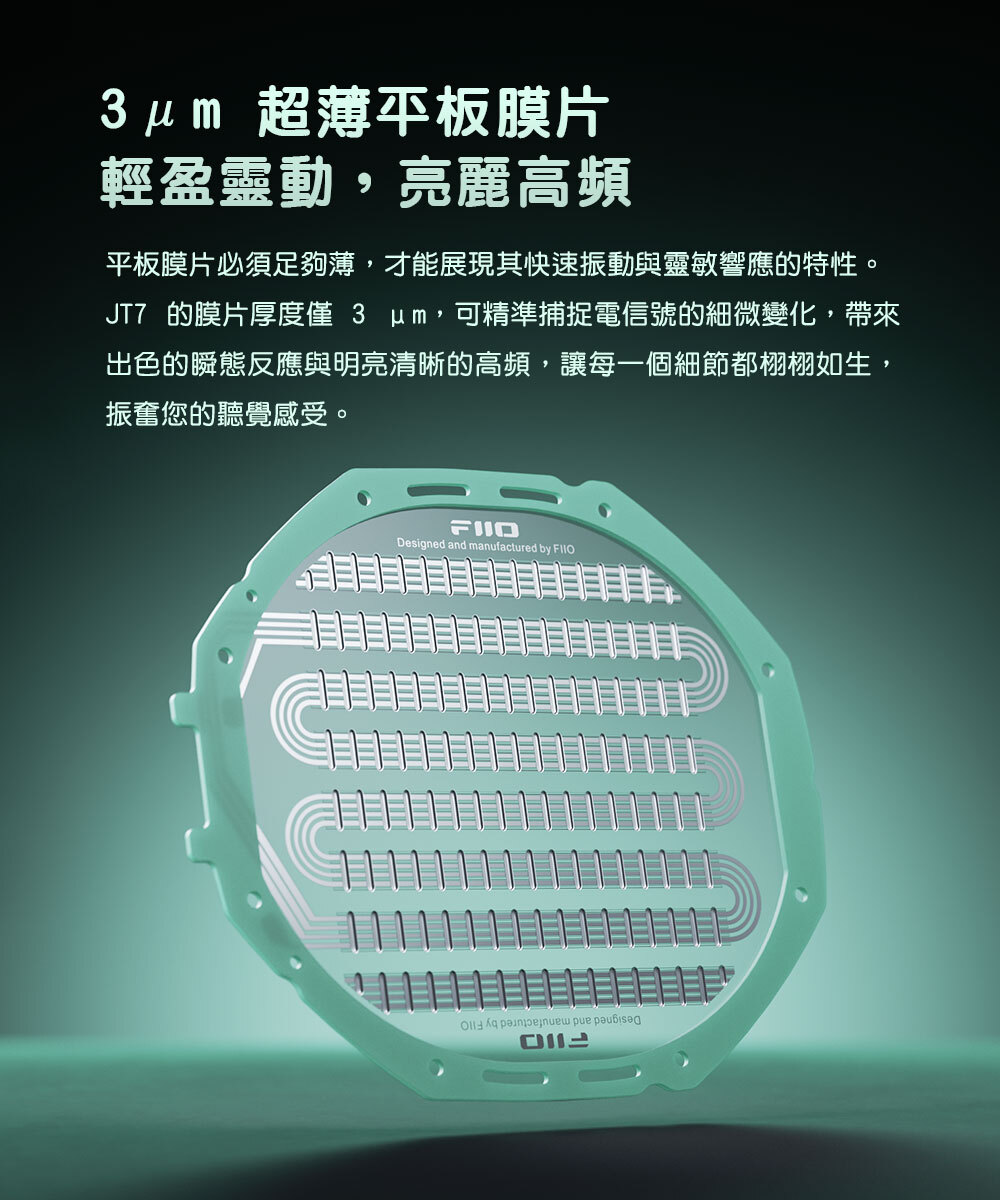 JT7 耳機沿用 FP3、FT1 Pro 與 FT7 的高規格製程工藝;與傳統工藝不同,JT7 使用源自半導體產業的高精密鍍膜技術,使音圈與膜片一體成型;這也大幅提升音圈的牢固性與耐用度。