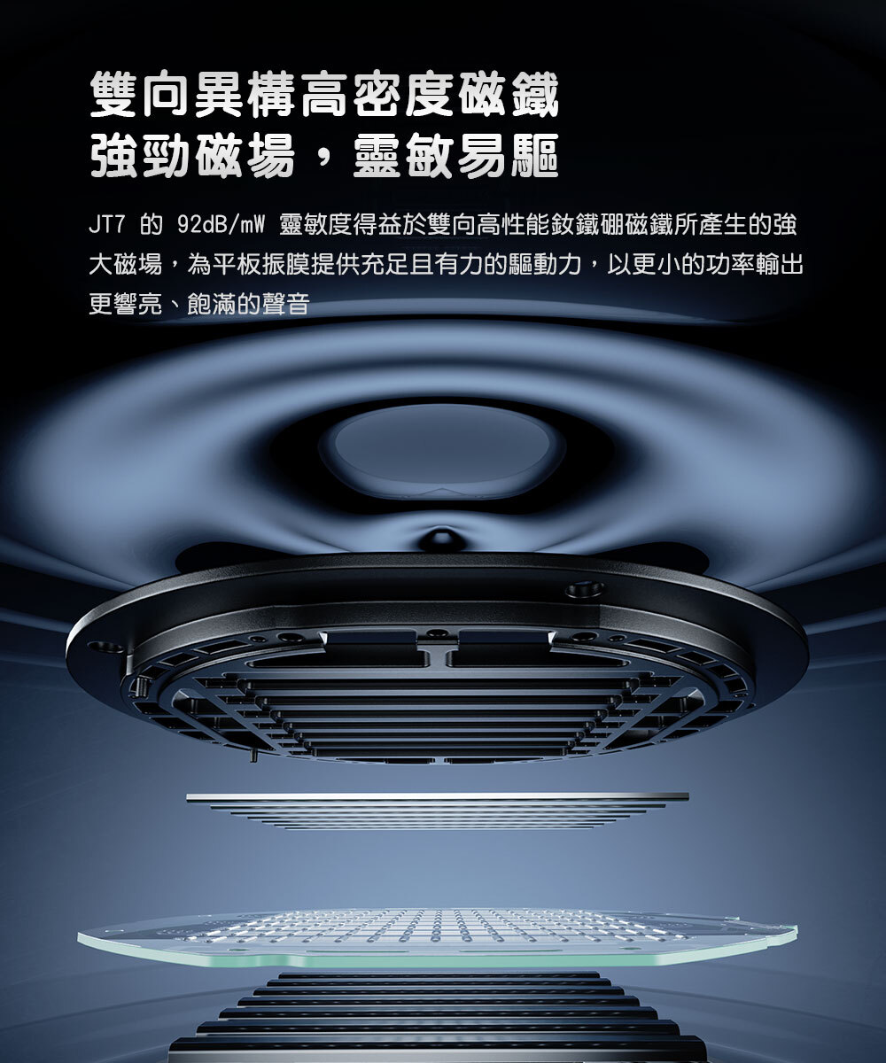 JT7 的 92 dB/mW 靈敏度得益於雙向高性能釹鐵硼磁鐵所產生的強大磁場,為平板振膜提供充足且有力的驅動力,以更小的功率輸出更響亮、飽滿的聲音