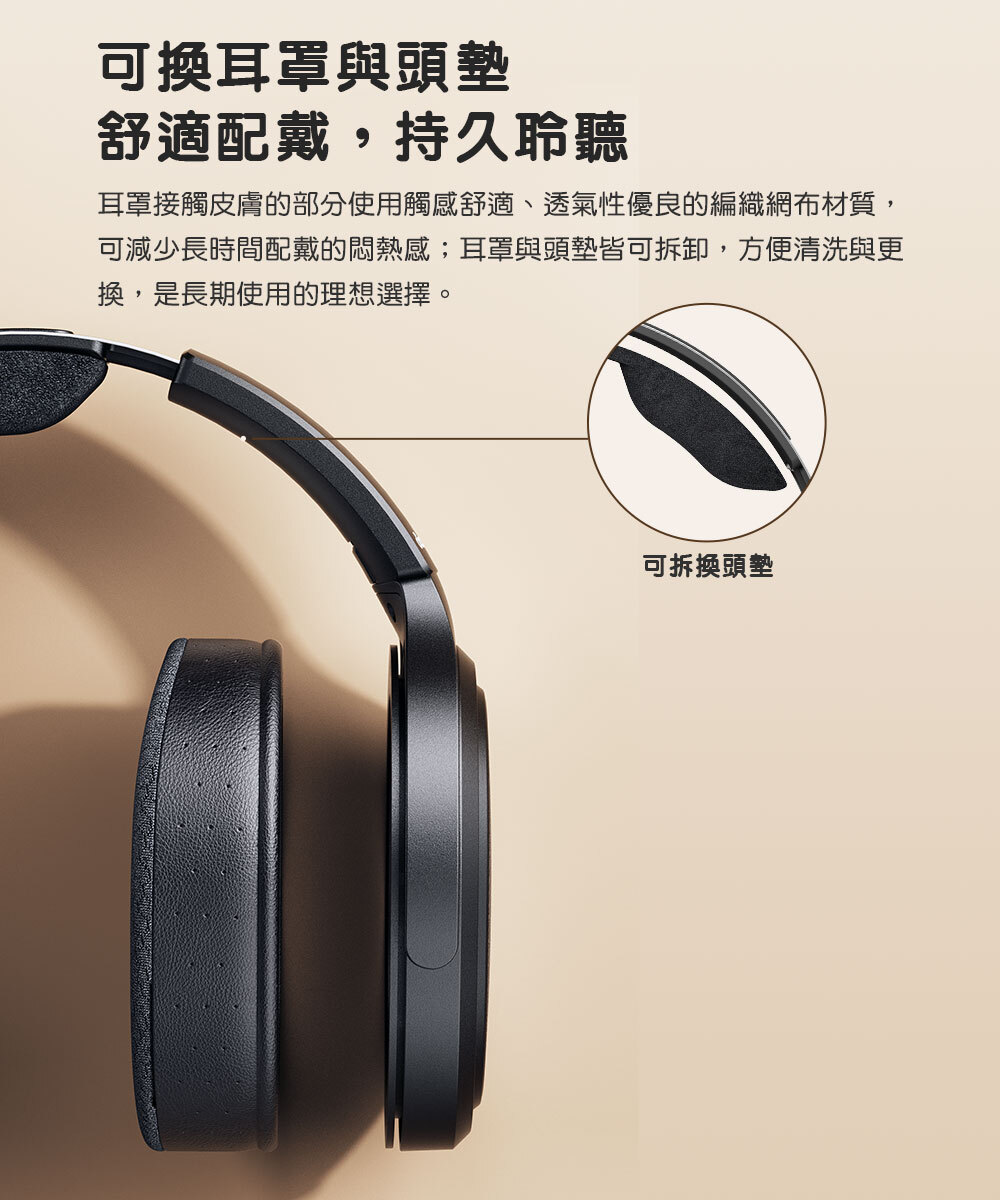 耳罩接觸皮膚的部分使用觸感舒適、透氣性優良的編織網布材質,可減少長時間佩戴的悶熱感;耳罩與頭墊皆可拆卸,方便清洗與更換,是長期使用的理想選擇。