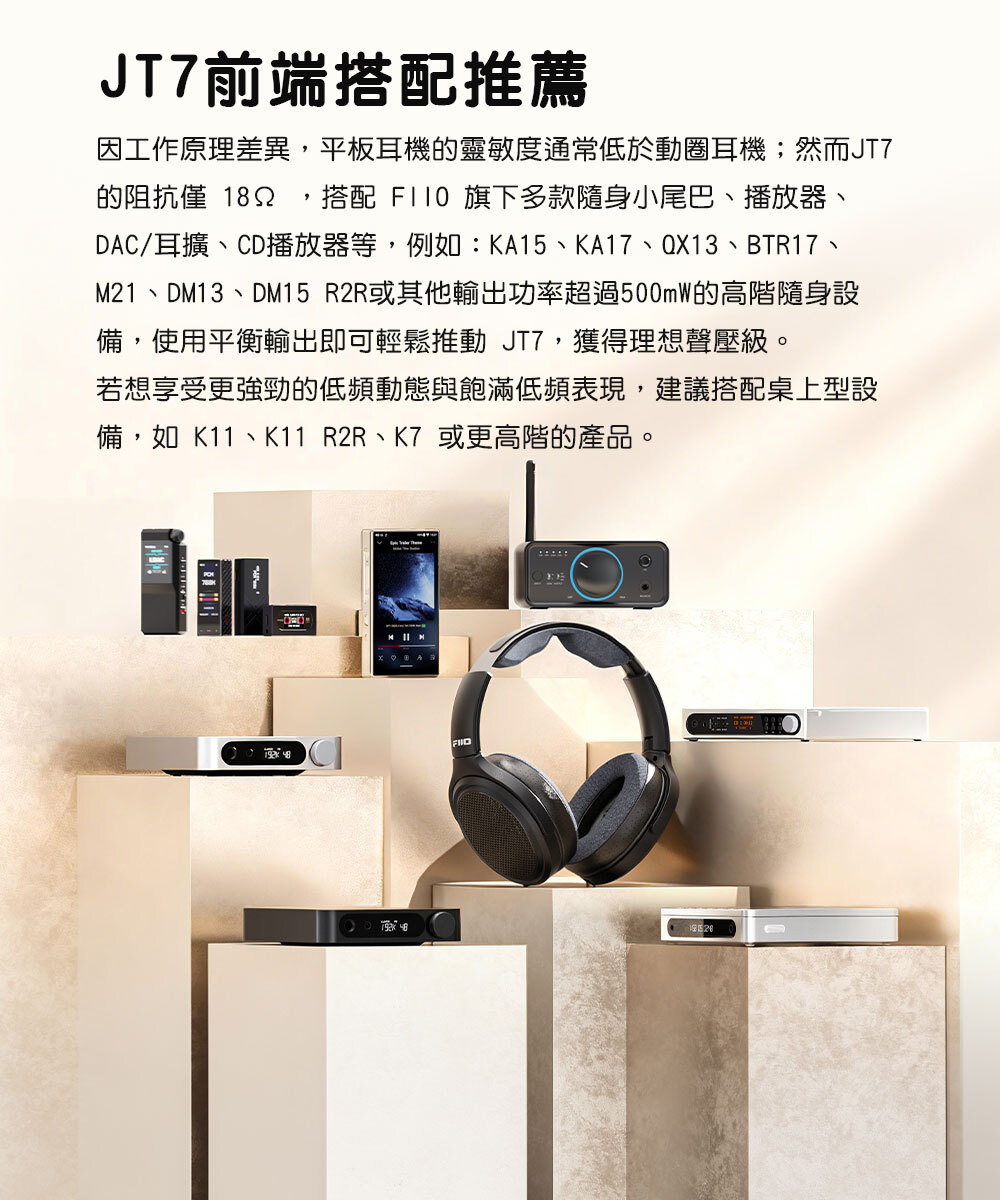 因工作原理差異,平板耳機的靈敏度通常低於動圈耳機;然而 JT7 的阻抗僅 18Ω,搭配FIIO旗下多款隨身小尾巴、播放器、DAC/耳擴、CD播放器等,例如KA15、KA17、QX13、BTR17、M21、DM13、DM15 R2R或其他輸出功率超過500mW的高階隨身設備,使用平衡輸出即可輕鬆推動 JT7,獲得理想聲壓級。