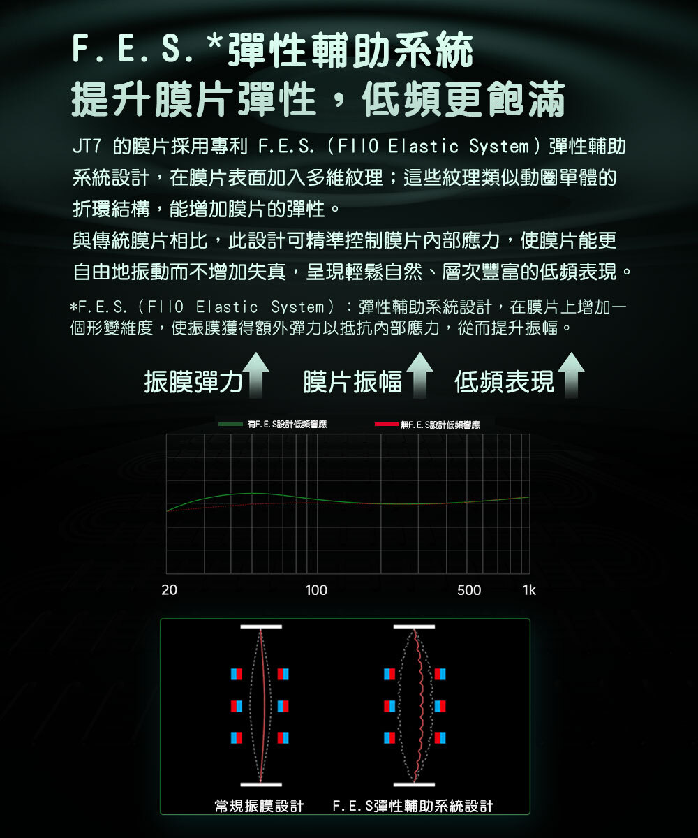 JT7 的膜片採用專利 F.E.S.(FIIO Elastic System)彈性輔助系統設計,在膜片表面加入多維紋理;這些紋理類似動圈單體的折環結構,能增加膜片的彈性。