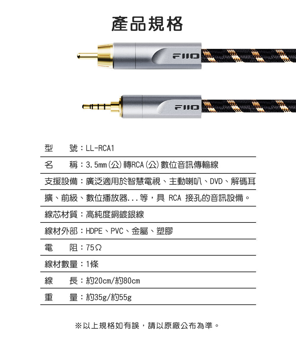注意事項:1.本產品僅包含LL-RCA1*1,其他播放器、音響、手機...等等僅為示意圖,不包含在本產品包裝內。