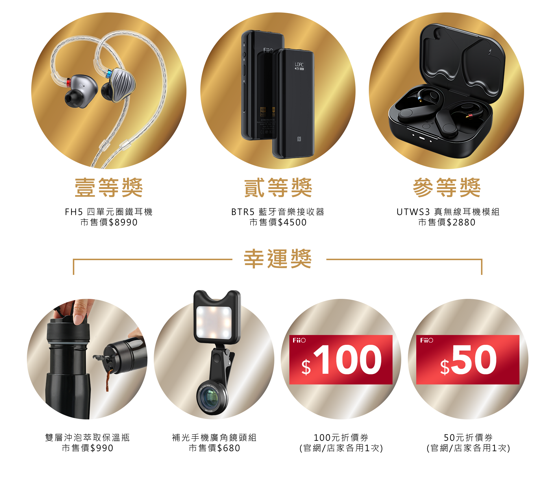 ▍參加辦法:於官網、各大網購平台、全台經銷據點,購買FiiO 播放器、耳機、耳擴等種類產品,即可獲得限量、100%中獎機率刮刮卡乙張!