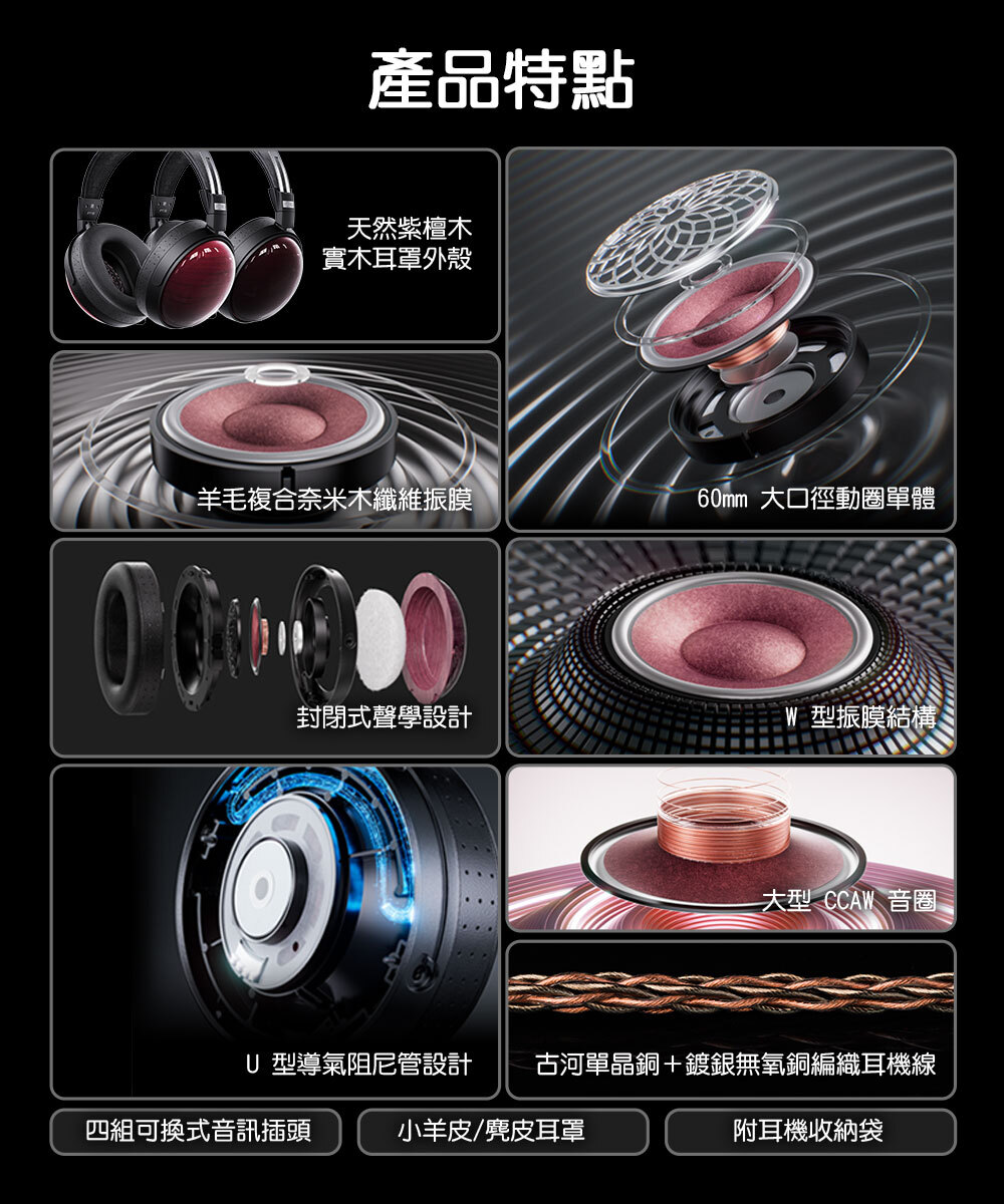 注意事項:產品僅包含羊皮耳罩*1、麂皮耳罩*1、4.4mm平衡可換插頭*1、4.4mm(母)轉XLR(公)轉接頭、3.5mm轉6.35m轉接頭*1、3.5mm單端可拆轉接頭*1、使用說明書*1、收納袋*1、清潔布*1。