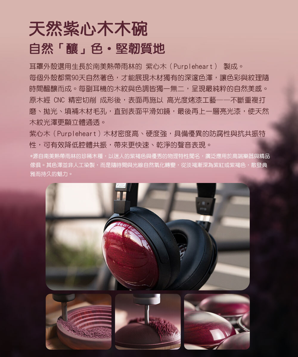 自 1920 年代以來,紫心木(Purpleheart)被廣泛運用於樂器與精品傢俱,是大自然的珍寶。木材從南美遠渡至江蘇連雲港,經高溫窯烘、靜置熟成,歷經數月在黑暗中「釀」出迷人的酒紅色澤。接著再經嚴選、精密 CNC 雕刻、打磨與上漆,最終化為一副融合自然與工藝的木質耳罩。