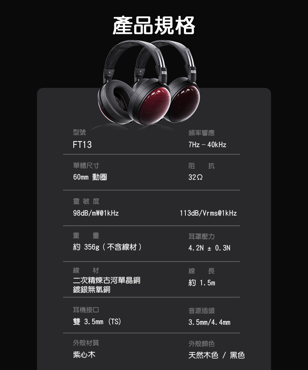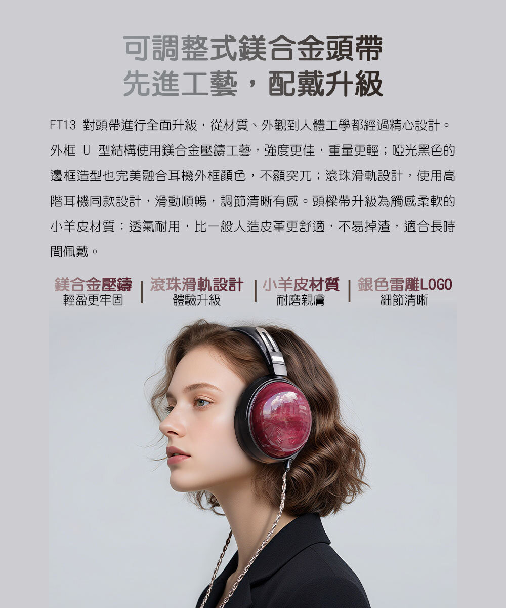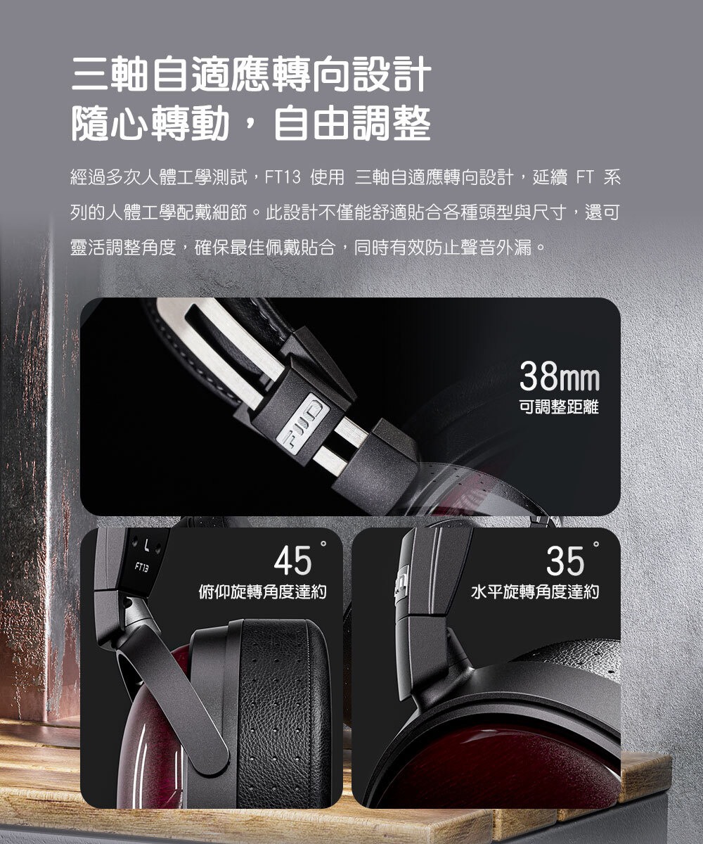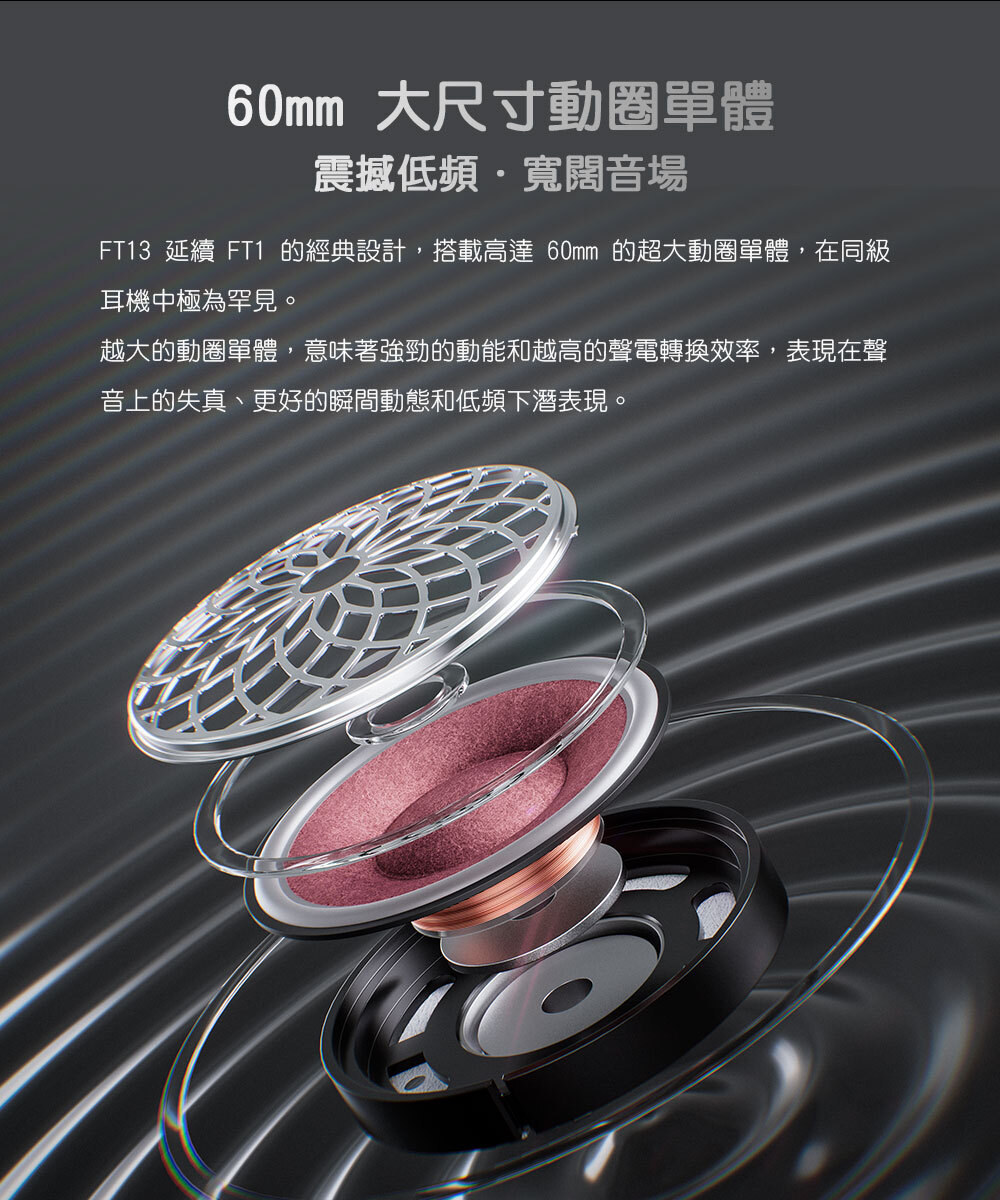 60mm大尺寸動圈單體|FT13 延續 FT1 的經典設計,搭載高達 60mm 的超大動圈單體,在同級耳機中極為罕見。