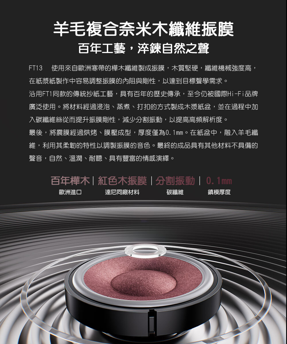 羊毛複合奈米木纖維振膜|FT13 使用來自歐洲寒帶的樺木纖維製成振膜,木質堅硬,纖維機械強度高,在紙漿紙製作中容易調整振膜的內阻與剛性,以達到目標聲學需求。