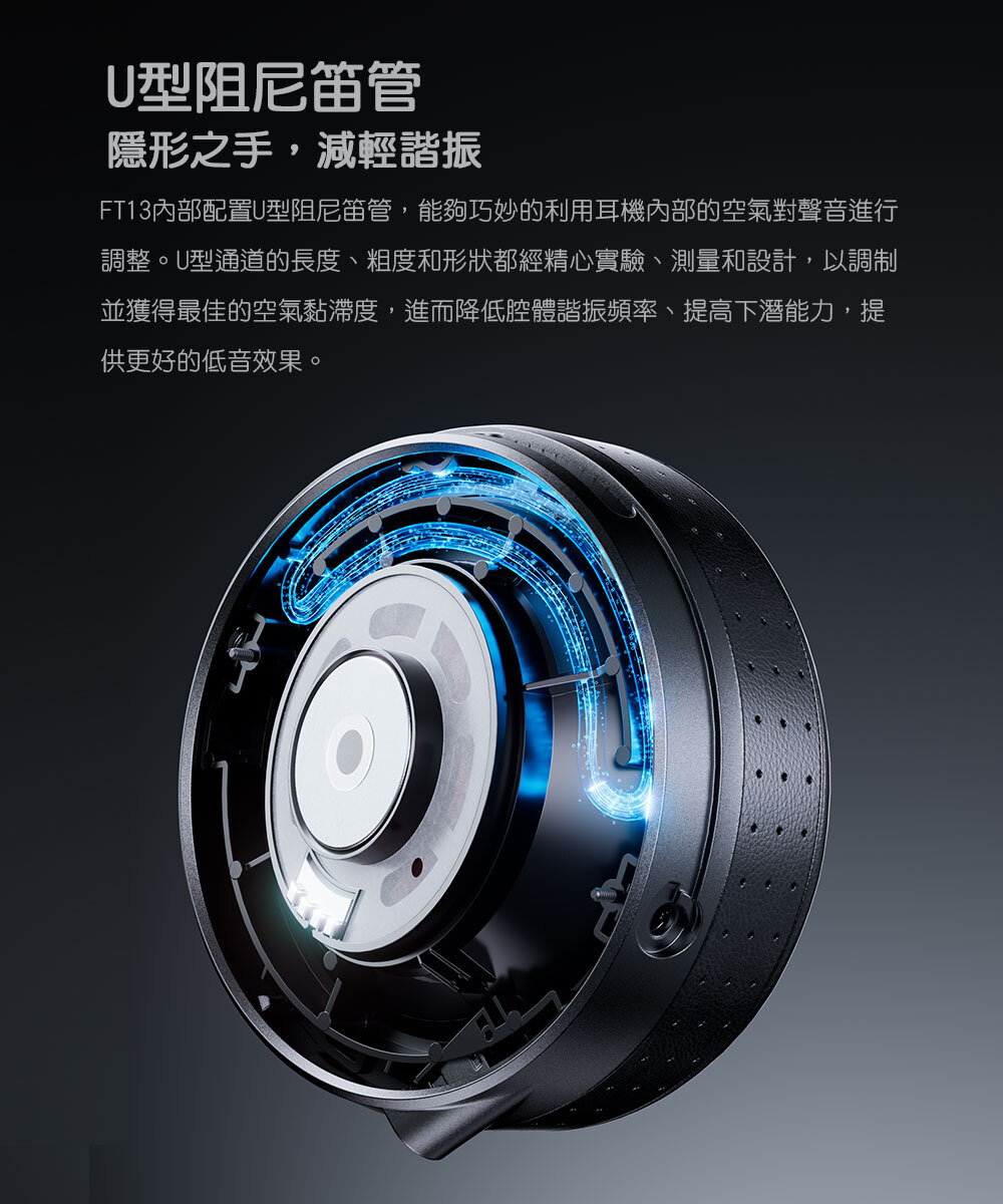 U型阻尼笛管|FT13內部配置U型阻尼笛管,能夠巧妙的利用耳機內部的空氣對聲音進行調整。U型通道的長度、粗度和形狀都經精心實驗、測量和設計,以調制並獲得最佳的空氣黏滯度,進而降低腔體諧振頻率、提高下潛能力,提供更好的低音效果。