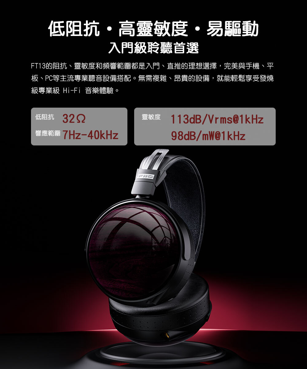 低阻抗・高靈敏度・易驅動|FT13的阻抗、靈敏度和頻響範圍都是入門、直推的理想選擇,完美與手機、平板、PC等主流專業聽音設備搭配。無需複雜、昂貴的設備,就能輕鬆享受發燒級專業級 Hi-Fi 音樂體驗。