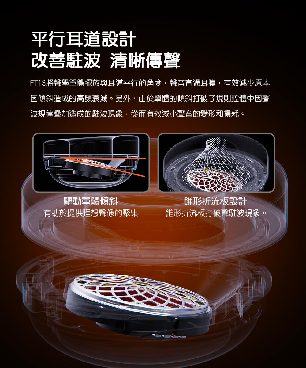 平行耳道設計|FT13將聲學單體擺放與耳道平行的角度,聲音直通耳膜,有效減少原本因傾斜造成的高頻衰減。