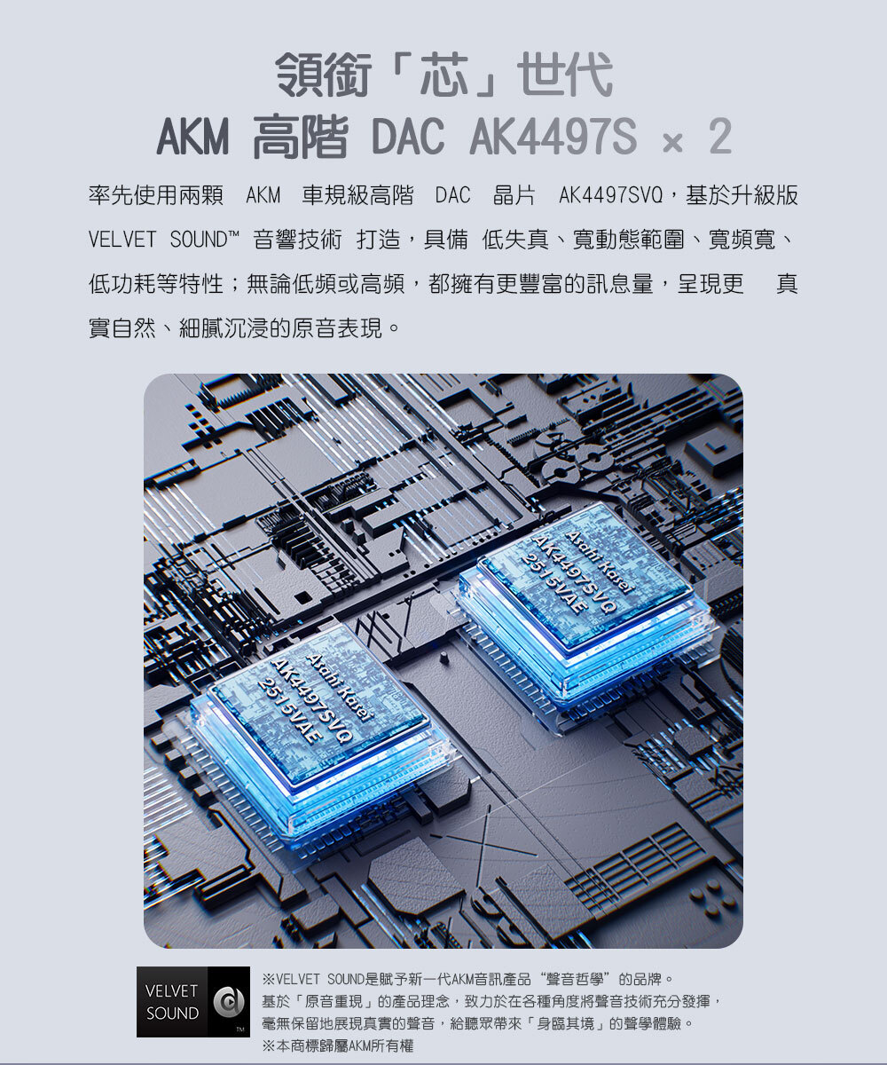 率先使用兩顆 AKM 車規級高階 DAC 晶片 AK4497SVQ,基於升級版 VELVET SOUND™ 音響技術 打造,具備 低失真、寬動態範圍、寬頻寬、低功耗 等特性。