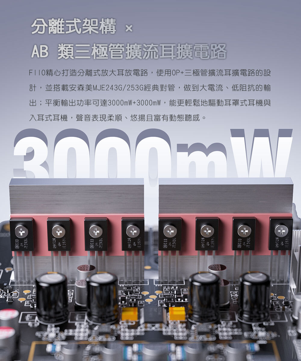 FIIO精心打造分離式放大耳放電路,使用OP+三極管擴流耳擴電路的設計,並搭載安森美 MJE243G/253G 經典對管,做到大電流、低阻抗的輸出。平衡輸出功率可達3000mW+3000mW,能更輕鬆地驅動耳罩式耳機與入耳式耳機,聲音表現柔順、悠揚且富有動態聽感。