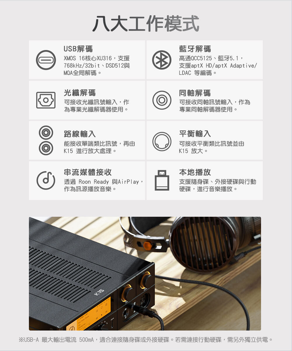 工作模式: USB DAC 模式、同軸解碼模式、光纖解碼模式、Line in 模式、平衡輸入模式、藍牙接收模式、串流媒體接收模式、本地播放模式