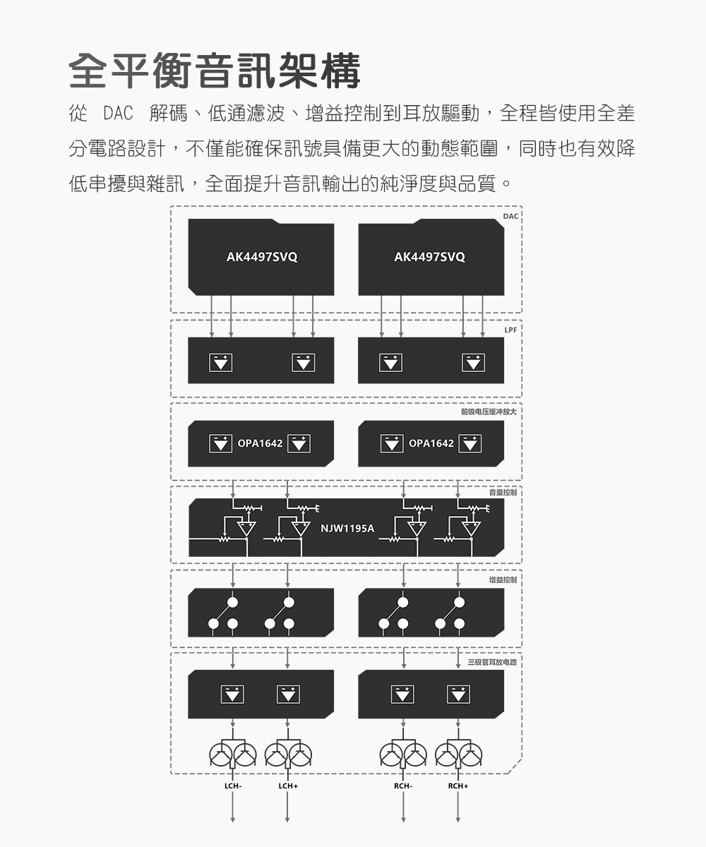 從 DAC 解碼、低通濾波、增益控制到耳放驅動,全程皆使用全差分電路設計,不僅能確保訊號具備更大的動態範圍,同時也有效降低串擾與雜訊,全面提升音訊輸出的純淨度與品質。