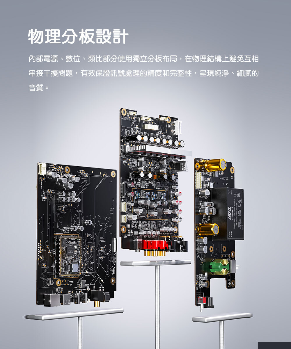 實體分板設計的內部電源、數位與類比部分採用獨立的分板布局,在物理結構上避免彼此之間的串擾,能有效確保訊號處理的精度與完整性,呈現純淨、細膩的音質。