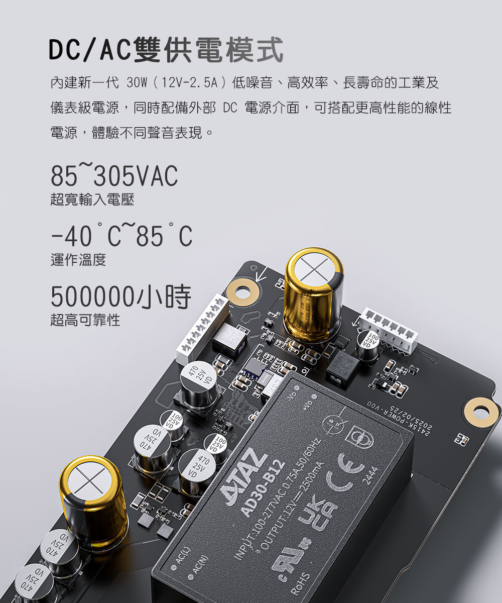 內建新一代 30W(12V‑2.5A)低噪音、高效率、長壽命的工業及儀表級電源,同時配備外部 DC 電源介面,可搭配更高性能的線性電源,體驗不同聲音表現。
