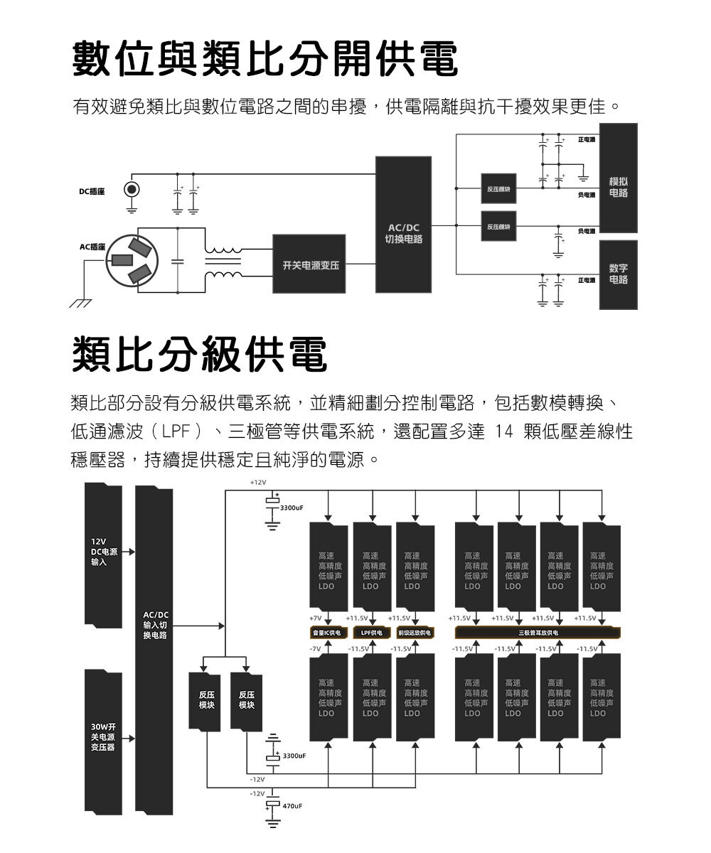 類比部分設有分級供電系統,並精細劃分控制電路,包括數模轉換、低通濾波(LPF)、三極管等供電系統,還配置多達 14 顆低壓差線性穩壓器,持續提供穩定且純淨的電源。