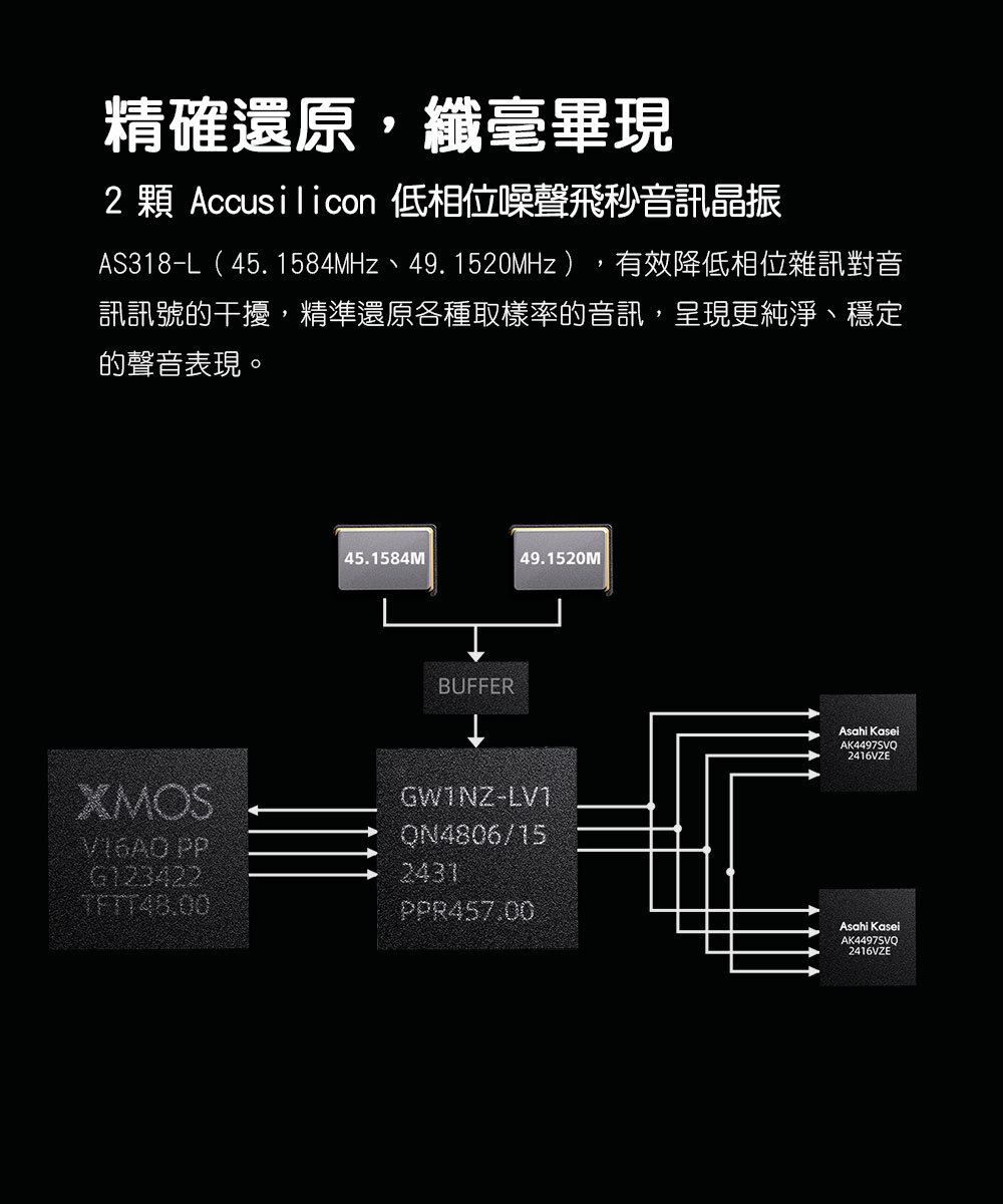 使用 2 顆 Accusilicon 低相位噪聲飛秒音訊晶振—AS318‑L(45.1584MHz、49.1520MHz),有效降低相位雜訊對音訊訊號的干擾,精準還原各種取樣率的音訊,呈現更純淨、穩定的聲音表現。