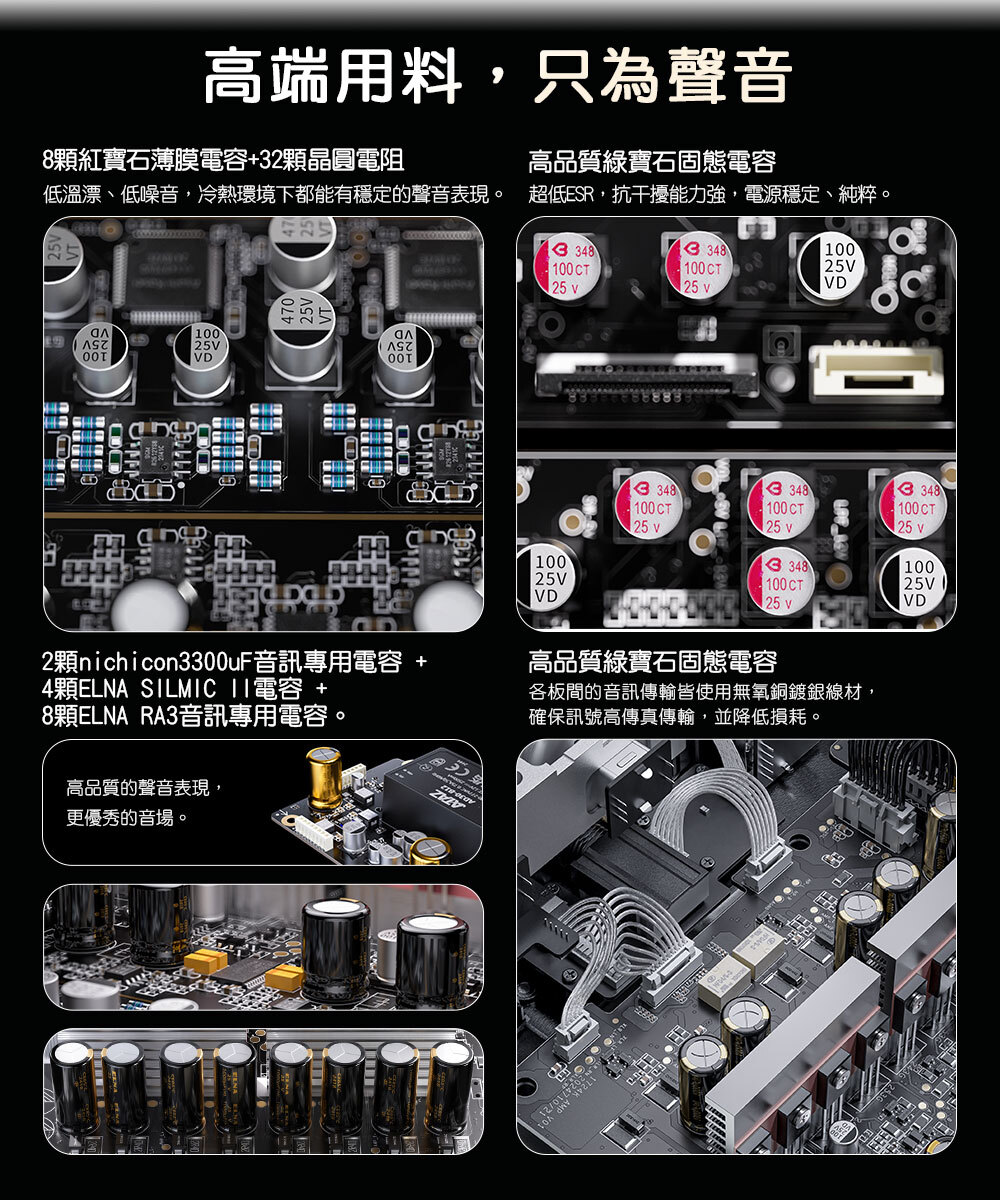 2顆nichicon3300uF音訊專用電容+4顆ELNA SILMIC II電容+8顆ELNA RA3音訊專用電容。|高品質的聲音表現,更優秀的音場。