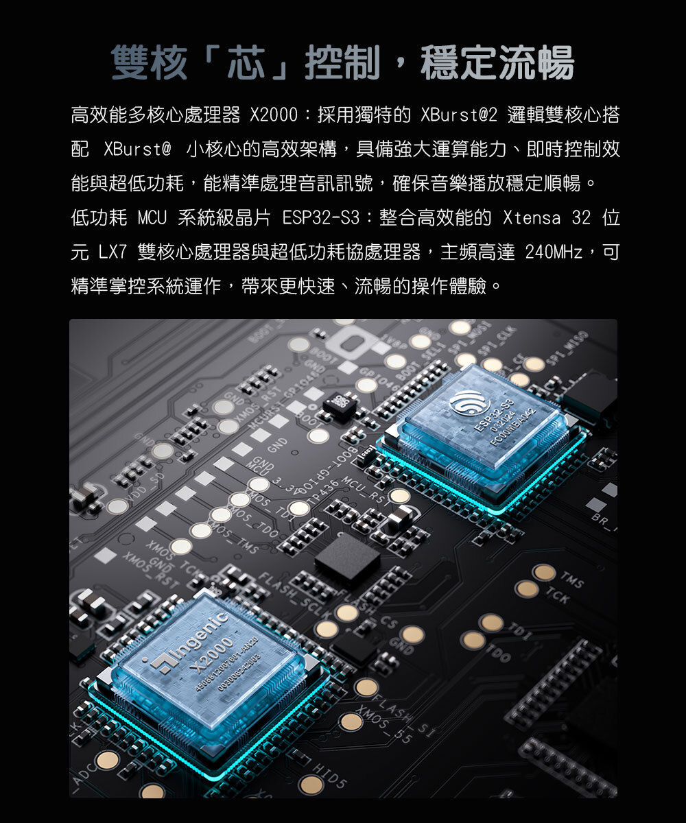 高效能多核心處理器 X2000:採用獨特的 XBurst@2 邏輯雙核心搭配 XBurst@ 小核心的高效架構,具備強大運算能力、即時控制效能與超低功耗,能精準處理音訊訊號,確保音樂播放穩定順暢。