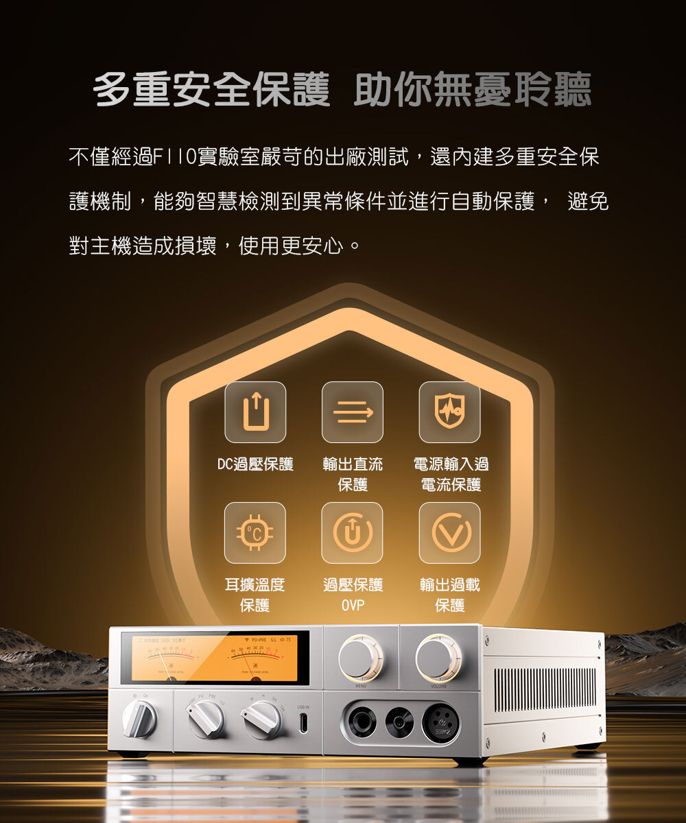 不僅經過FIIO實驗室嚴苛的出廠測試,還內建多重安全保護機制,能夠智慧檢測到異常條件並進行自動保護,避免對主機造成損壞,使用更安心。