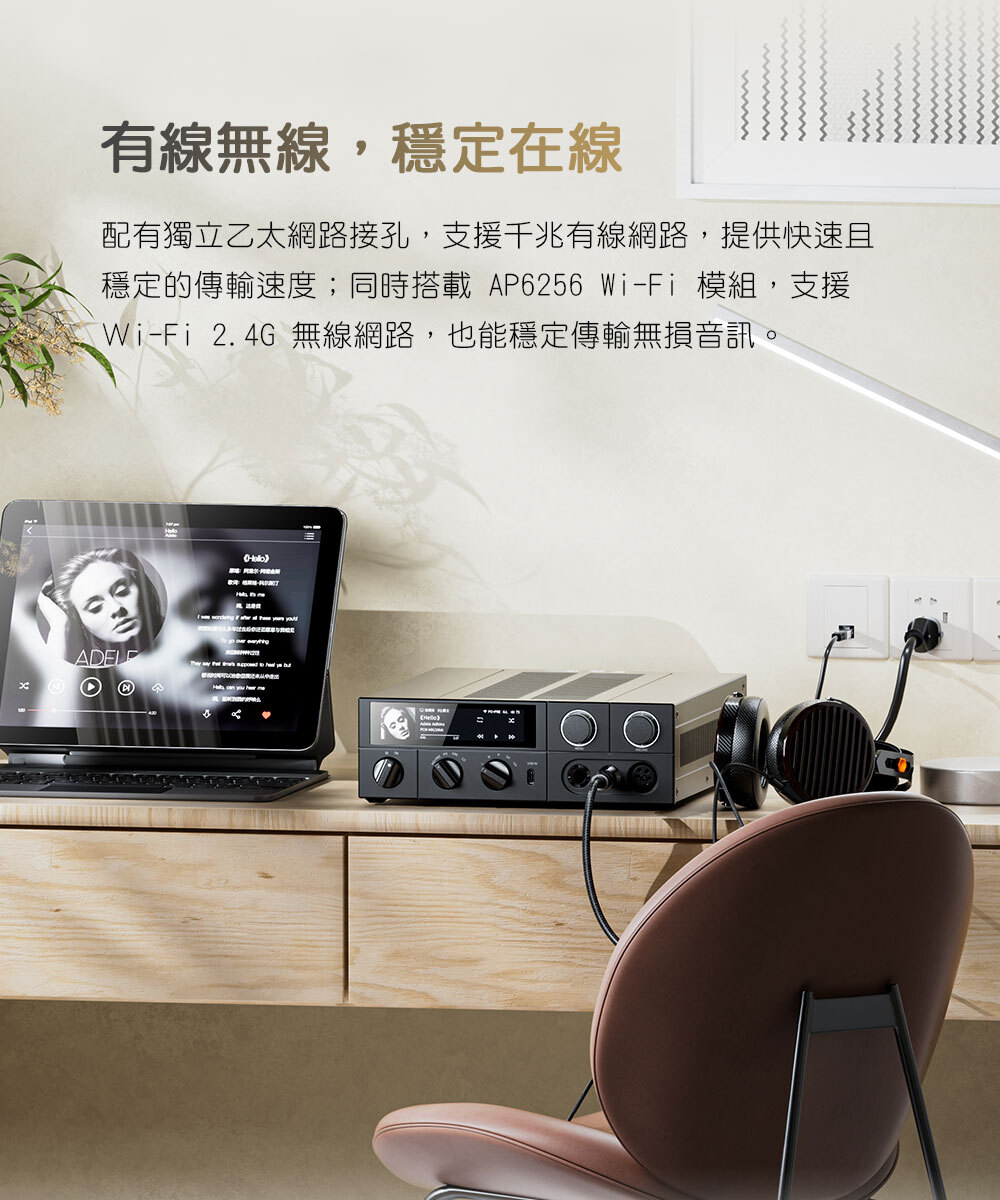 配有獨立乙太網路接孔,支援千兆有線網路,提供快速且穩定的傳輸速度;同時搭載 AP6256 Wi-Fi 模組,支援 Wi-Fi 2.4G 無線網路,也能穩定傳輸無損音訊。