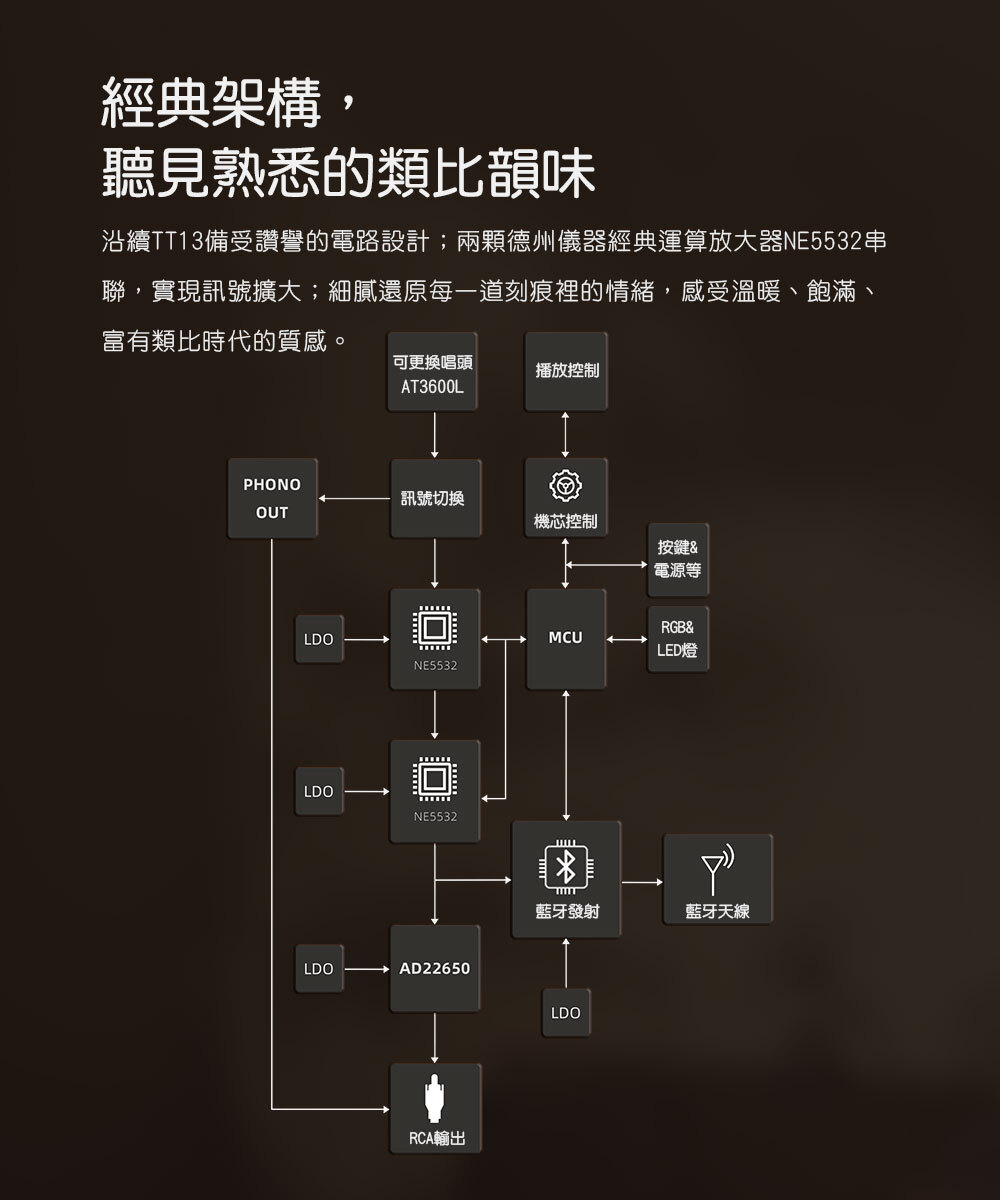 沿續TT13備受讚譽的電路設計;兩顆德州儀器經典運算放大器NE5532串聯,實現訊號擴大。