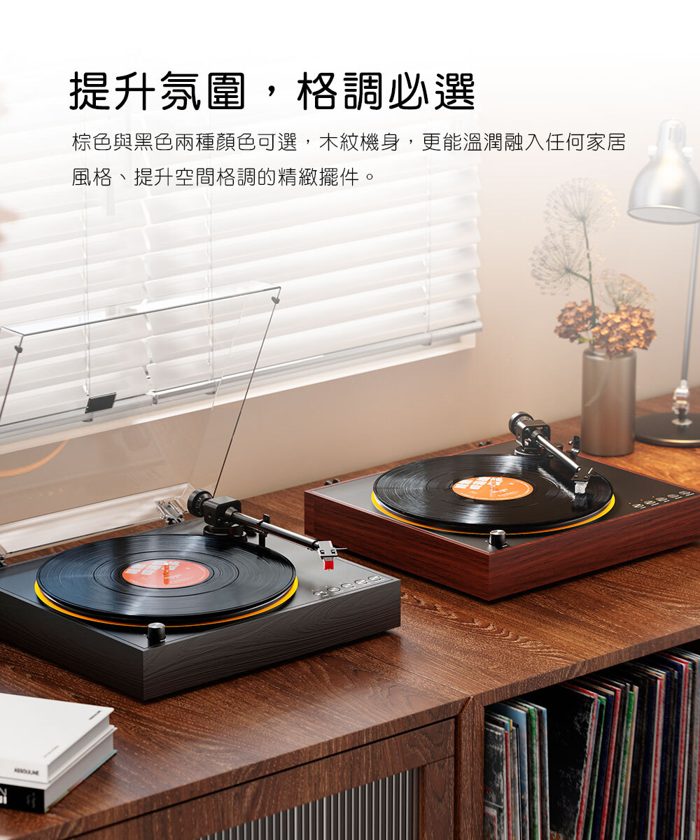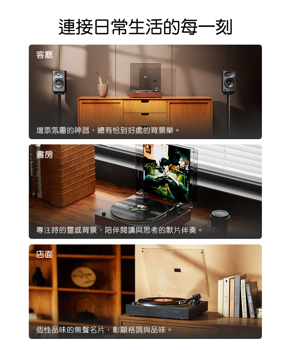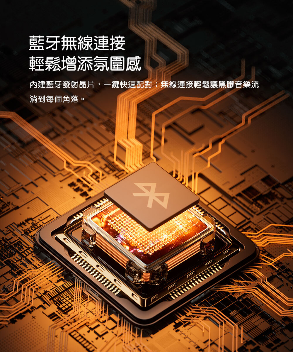 內建藍牙發射晶片,一鍵快速配對;無線連接輕鬆讓黑膠音樂流淌到每個角落。