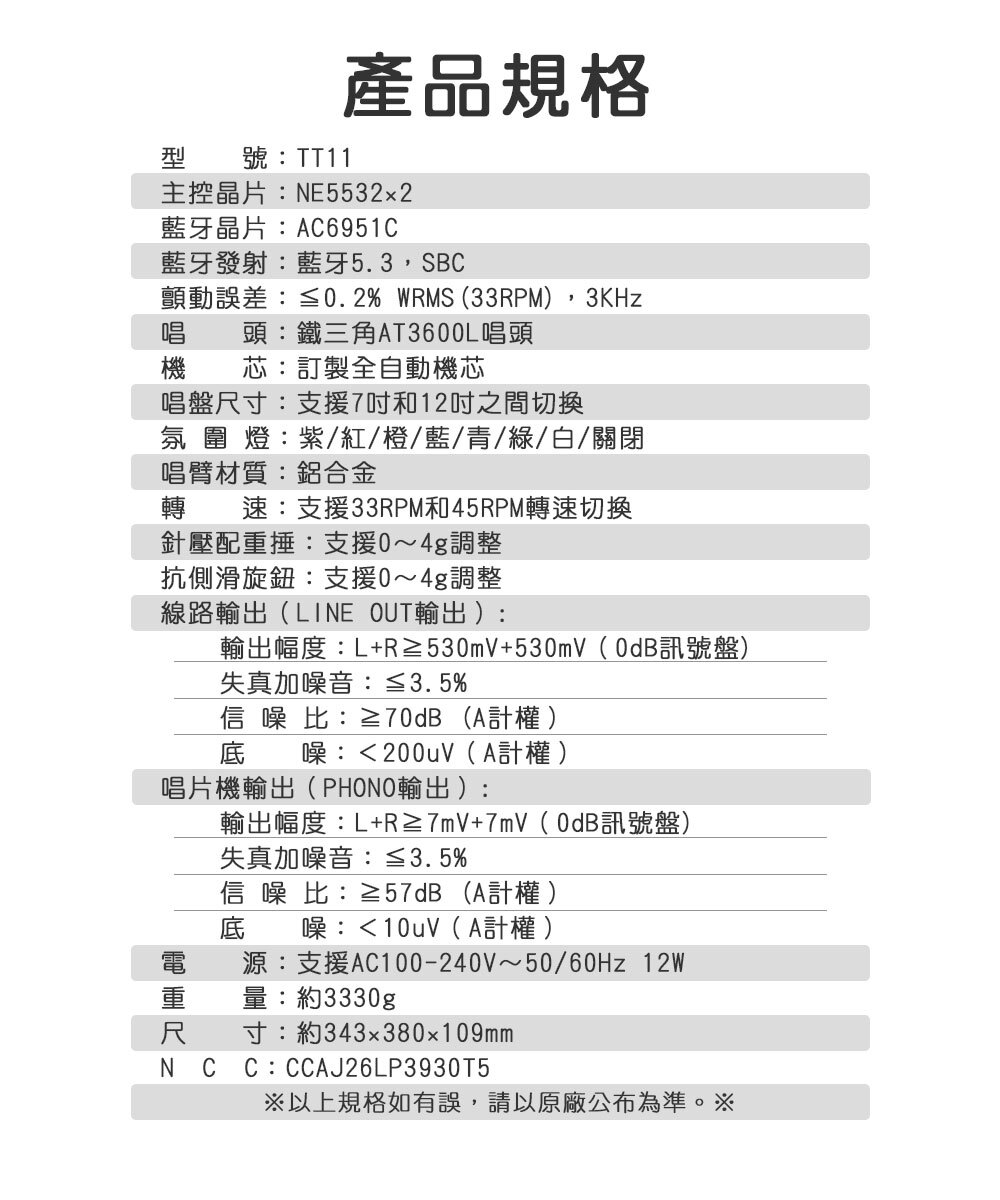 注意事項:本產品僅包含TT11主機*1、透明保護蓋*1、鋁製轉盤*1、轉盤墊*1、針壓調整配重捶*1、翻蓋轉軸*2、電源線*1、RCA音源線*1、7吋黑膠唱片45轉速大孔唱片轉換座*1、使用說明書*1,其他唱片、音響...等,僅為示意圖,不包含在本產品包裝內。