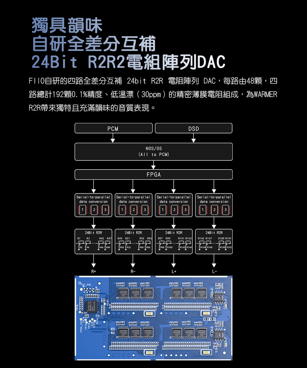 FIIO自研的四路全差分互補 24bit R2R 電阻陣列 DAC,每路由48顆,四路總計192顆0.1%精度、低溫漂(30ppm)的精密薄膜電阻組成,為WARMER R2R帶來獨特且充滿韻味的音質表現。