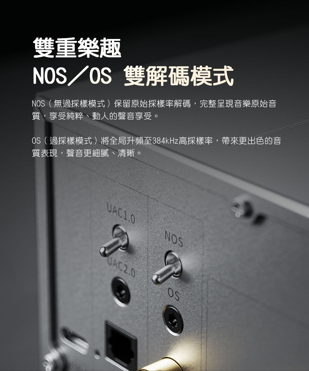 NOS(無過採樣模式)保留原始採樣率解碼,完整呈現音樂原始音質,享受純粹、動人的聲音享受。