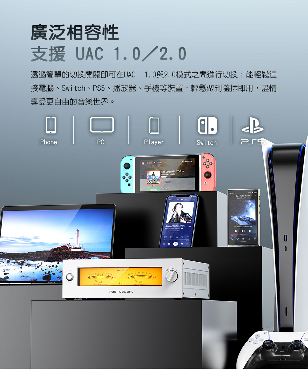 透過簡單的切換開關即可在UAC 1.0與2.0模式之間進行切換;能輕鬆連接電腦、Switch、PS5、播放器、手機等裝置,輕鬆做到隨插即用,盡情享受更自由的音樂世界。